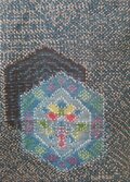 地色は、少し緑がかったブルーと黒、白よりのグレーです。そこに、黄色、緑、グレー、赤等で模様が描かれています。