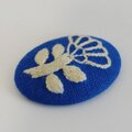 ロイヤルブルーのリネン地にクリーム色の糸。北欧風の大人可愛いテザインで小さなお花を丁寧に刺繍しました。