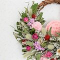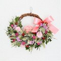濃いピンクのミニバラが、リースのアクセントになっています。