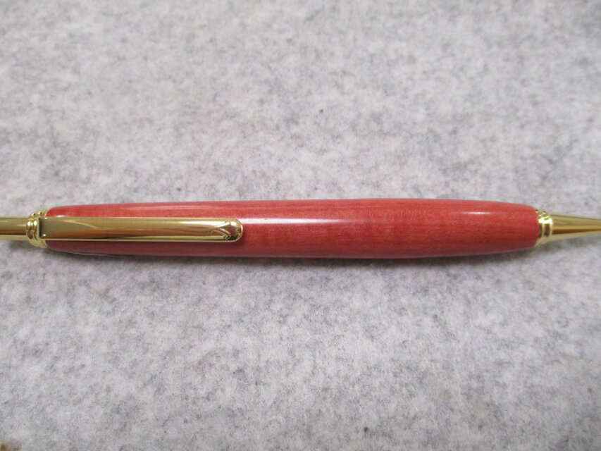 このペンは、木肌がピンク色で大変美しく、胴軸にうっすらと縮み杢が入り木肌がキラキラと輝く逸品です。