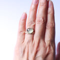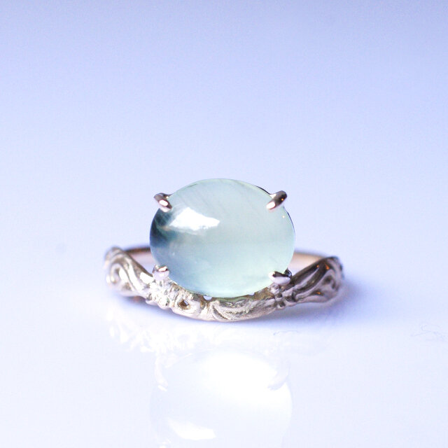 商品画像や説明の通りで、素敵なリングでした。氷ひすいの優しい色と、アームは実は仏さまがいるという、個性的なデザインに惹かれました。また、仕上げの艶消し加工が本当に綺麗です。指にスッと馴染み着け心地も良いです。たいへん気に入りました。大切にします。丁寧なご対応もありがとうございました。