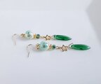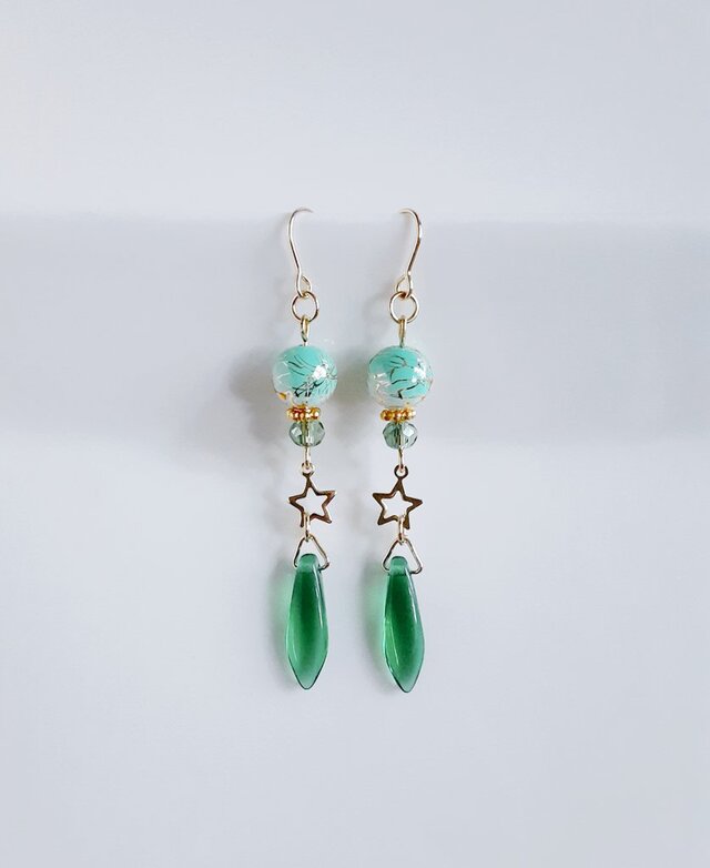 ぷっくりシャープな形が素敵なチェコダガービーズと和風な柄がとても綺麗な翡翠色の唐草ビーズをメインにゴールド色のお星様のパーツやライトグリーン色のガラスビーズを合わせたお洒落な揺れるタイプのピアスとなっております☆