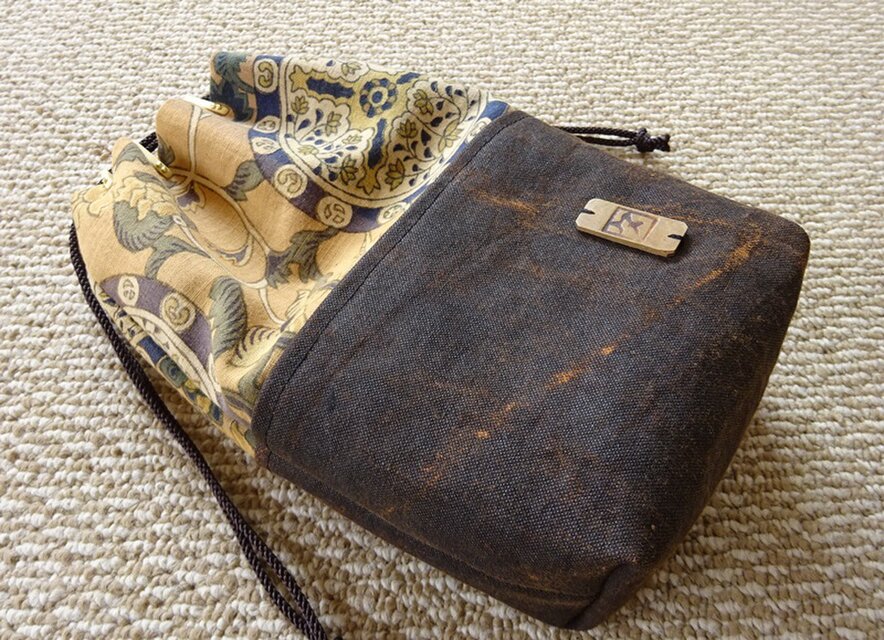 古い更紗を楽しむ巾着です。時代のあるものですが状態が良いのが魅力。柄、色共に楽しめそうなものです。底は泥染め布を合わせました(こちらは古布ではありません)。小さな木札がアクセントアクセントです。