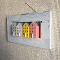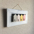流木、ねじ・釘(赤錆加工)、ホワイトウッド(欧州スプルース、ドイツトウヒなど)、ステイン、ペンキ等で製作。ヤスリでダメージ感を演出しています。「潮騒とカモメの鳴き声、風の音」を感じていただければ幸いです。※額縁は、赤松材を使用しています。