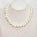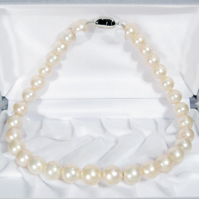 照りの美しい大粒の本真珠(淡水パール、有核)のネックレスです。縞の無い高品質の真珠を使っています。真珠の色合いはナチュラルカラーです。