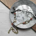 アンティークゴールドのチェーンに、ブラウンのお花モチーフのビーズが可憐に咲く、エレガントなグラスコードです。落ち着いた色合いのブラウンビーズと、華やかでありながらもどこか懐かしさを感じるデザインが、大人の女性にふさわしい上品な雰囲気を醸し出します。
