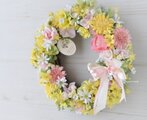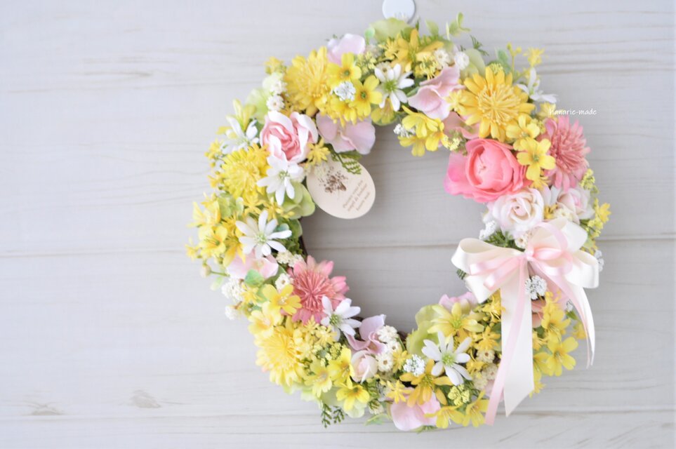 陽の光のように デージーと花々のリース:黄色 イエロー ピンク あじさい リボン