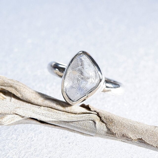 細かなブルーの針状デュモルチェライトを内包した水晶を、シンプルなリングに仕上げました。