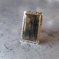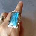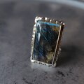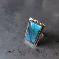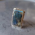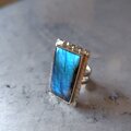 美しいブルーのシラーが浮かぶラブラドライトをラフな飾り枠を施しシルバーリングに仕立てました。