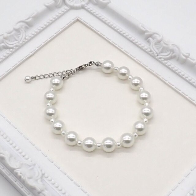 8㎜のパールの間に小さなパールを入れた軽やかなデザインのブレスレットです。