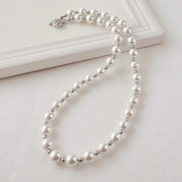 ホワイト系のカラーパールの間にライトグレーまたはベージュの小さなパールを入れた軽やかなデザインのネックレスです。