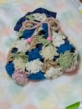 色鮮やかなお花のモチ━フを編んで、お弁当用巾着を作ってみました。大きさは25㎝×20㎝. お花見シ━ズンや行楽弁当を入れるのに如何ですか?
