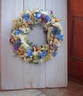 ブルーのデルフィニューム、ホワイトのラナンキュラスやスターチスなどドライフラワーを使ってナチュラルにアレンジしています。