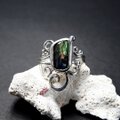 光りの当たる角度によって、メタリックな輝きが浮かぶスペクトロライトを唐草粒のリングに仕上げました。