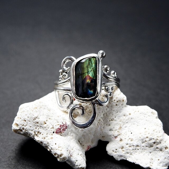 スペクトロライトの唐草粒飾りリング 14.5号