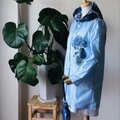ターコイズウォータードロップの水彩画のウォータープルーフジャケットをデザインしました。 2種類のウォータープルーフ素材をご用意しております。長袖で膝上丈のスタイリッシュなデザインです。
