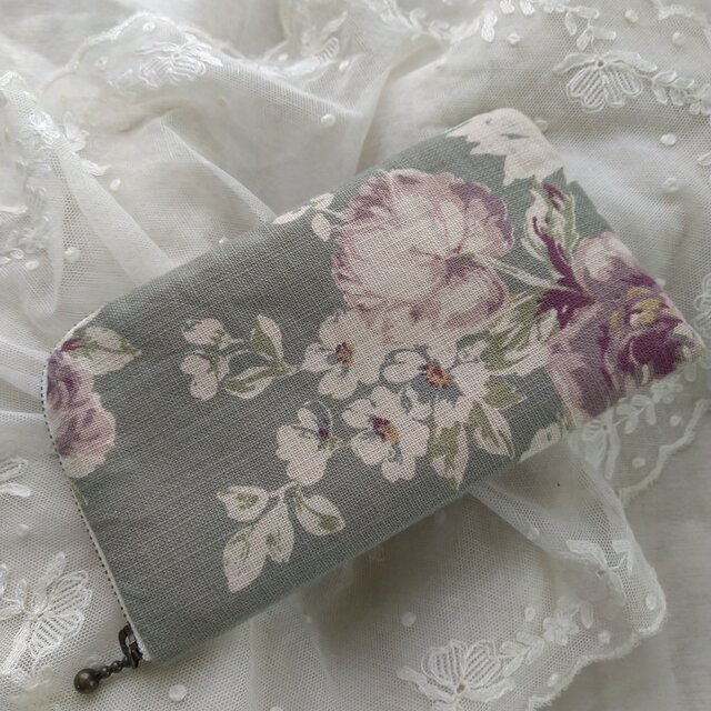 大きな薔薇のブーケ柄のコットンリネンで作ったL字型ポーチです。