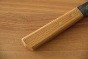 柄は他の包丁と同様、オリジナルの柄。打ち刃物の包丁でも、柄は外注品を取り付けるケースが多いですが、こちらは島田さんが1点1点削り製作しています。柄が外注品ですと、当然ながらよくある見たことのあるような雰囲気になりがちですが、菜切り包丁ながらも柄はナイフのような形で、真鍮で留めています。