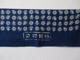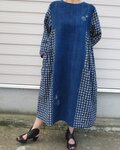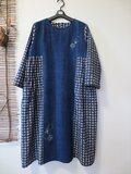 藍染無地と型染の反物を使用。藍無地の小穴を刺し子とパッチしています。