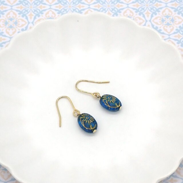 ゴールドのフラワーモチーフが施されたアンティークな雰囲気のオーバル形のチェコビーズのピアス/イヤリングです。