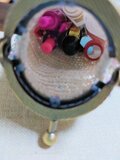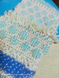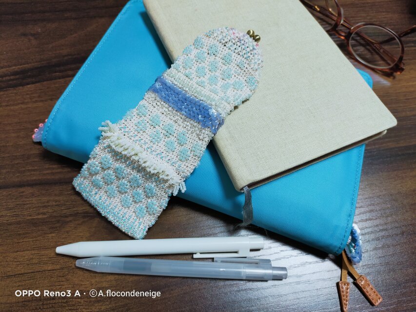 編地ベージュ色 ビーズは水色主体10色以上で装飾。