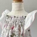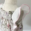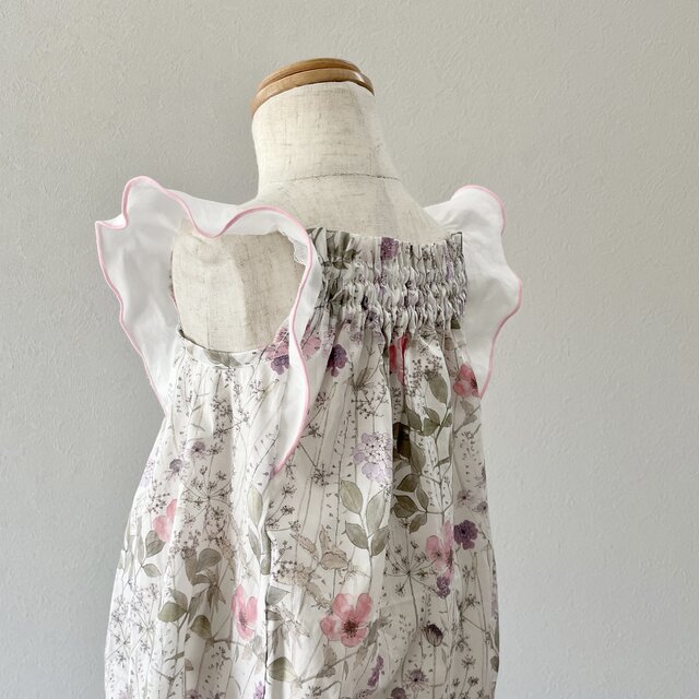 ☆ 優しく淡い色合いのリバティ・イルマのタナローンを使った、蝶々の羽のようなフリルが揺れるロンパースです。