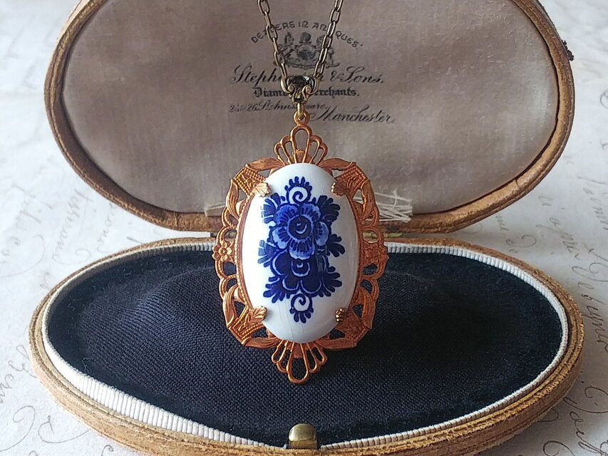 ヴィンテージ デルフトBlue-Flowerポーセリン クラシカルフィリグリーネックレス