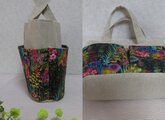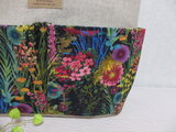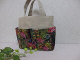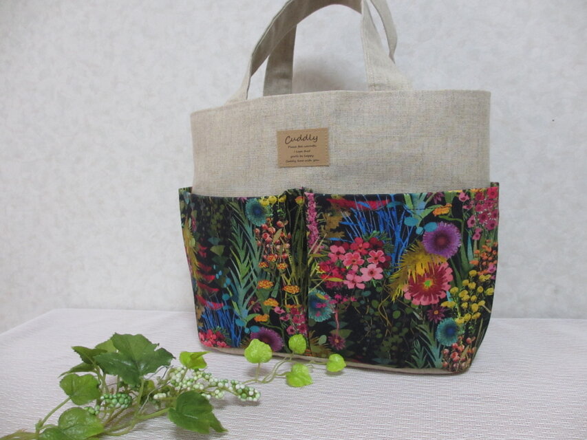黒地に色鮮やかな花々が咲きほこるリバティの生地をポケットに使用し、ポケットいっぱいのトートを作製しました。