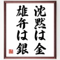 名言「沈黙は金、雄弁は銀」を書道家が毛筆書道で色紙に直筆、額に入れてお届けします。当店では挑戦、努力、成功、幸福、感謝、成長、家族、仕事、自己啓発など様々なテーマから人生の糧となる名言、四字熟語、諺、故事成語、格言を厳選、毛筆で直筆、お届けしています。これまで、6,000名以上の方からご注文いただき、お届けしてきました。