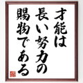 ナイチンゲールの名言「才能は長い努力の賜物である」を書道家が毛筆書道で色紙に直筆、額に入れてお届けします。当店では挑戦、努力、成功、幸福、感謝、成長、家族、仕事、自己啓発など様々なテーマから人生の糧となる名言、四字熟語、諺、故事成語、格言を厳選、毛筆で直筆、お届けしています。これまで、6,000名以上の方からご注文いただき、お届けしてきました。