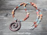 ハワイ産のコアの木を使って精巧にカービングされたコルをトップにハワイの夕日をイメージして、カーネリアン、ブルーガラス、本物の小さなシェルなどを繋げて、とーってもナチュラル感漂うボヘミアンでハワイアンなネックレスに仕上げました
