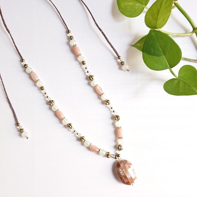 モザイクシェル オレンジムーンストーン プリナイト グリーンフローライト 水晶 メタルビーズ( ゴールド色 ) ワックスコード( グレイッシュブラウン )