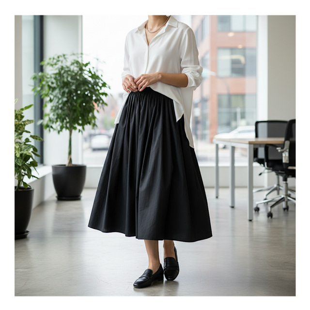 シンプルでギャザーたっぷりなデザインなので、様々なトップスとの相性も抜群です。