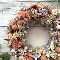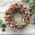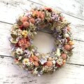 アプリコットカラーのスターチスが可愛いドライフラワーがいっぱいのリースです。