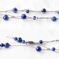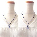 結び目を入れたグレー色のポリエステルコードにカットがにキラリと輝く濃淡のあるブルー~ネイビーのソーダライトとシルバー色のヘマタイトを散りばめた上品な雰囲気のネックレスです。