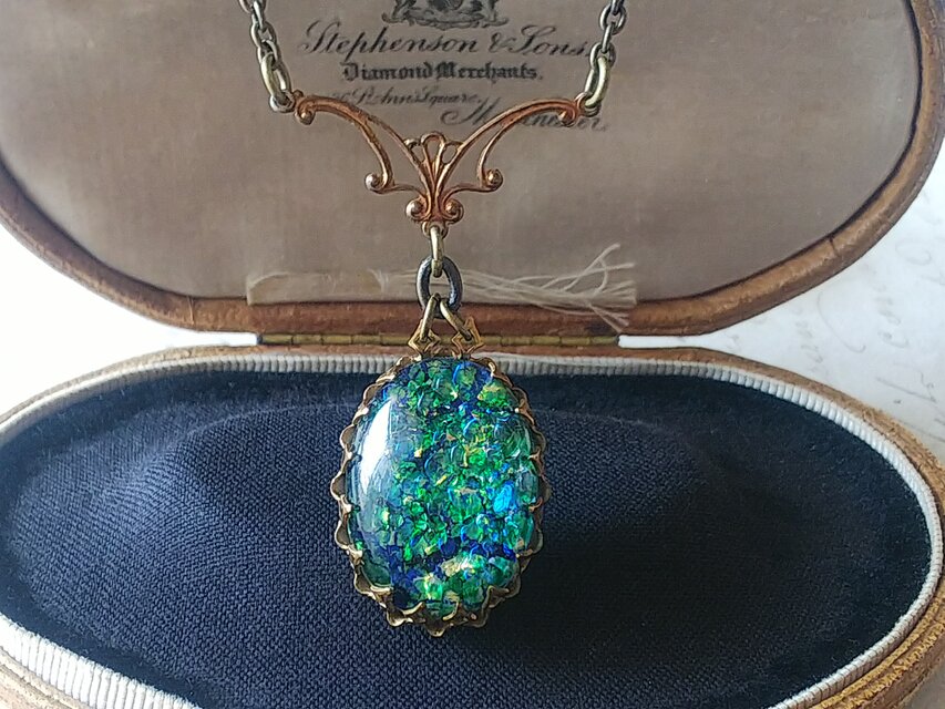 1940年代チェコスロバキアヴィンテージ、約25×18㎜の大粒のGreen系のドラゴンズブレスGlassでお作りしましたネックレスです。