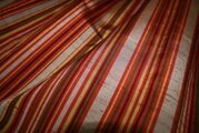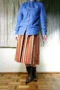 昭和に作られたと思われるコートを丁寧にほどき、洗い、ヒップハングスカートを作りました。生地のベースに朱にグレー、緑が混じり合い鮮やかなを縞模様を織りだしています。