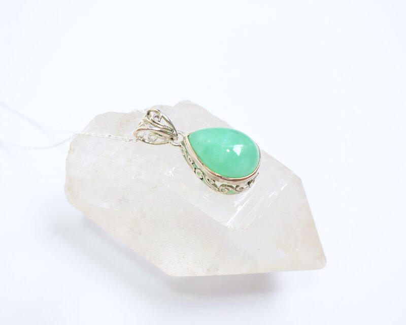 クリソプレーズは玉髄=ぎょくずいの一種で初々しく爽やかなマスカットグリーン色が特徴のきれいな石です。