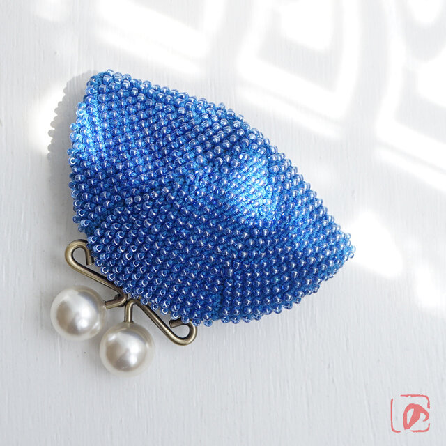 クリアブルー3mmのガラスビーズを全面に編み込みました。