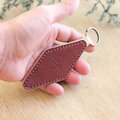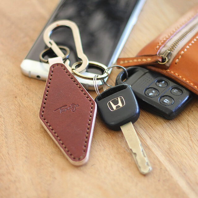 アメリカなど古いホテルなどでルームキーに付いているキーホルダー。それをイメージして協力な磁石を内蔵して本側仕立てで制作しました。