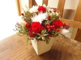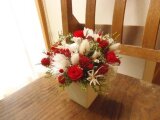 真っ赤なバラと白のプリザードアジサイや