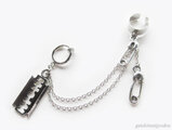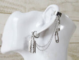 カミソリモチーフの揺れるイヤーカフスと小さな安全ピンモチーフが2つついたフープイヤリングを2連のチェーンで繋げました。