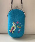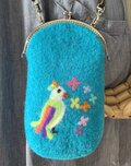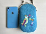 花舞う風景と小鳥の羊毛フェルトポーチポシェット(ブルー)