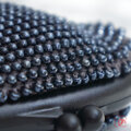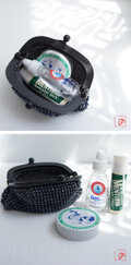 メタルブラックの3mmガラスビーズをひとつぶづつ全面に編み込んだがま口です。