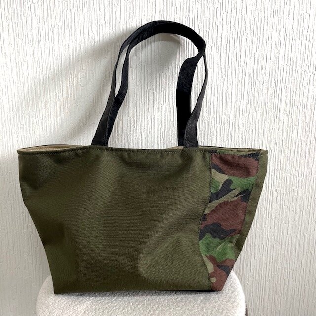 コーデュラナイロンの肩掛けトートバック・カーキ。カモフラ柄中サイズ