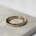 エッジの効いたミニマルなフォルムが存在感抜群で、指元にアクセントをプラスしてくれます。不均一な凸凹感が印象的な槌目模様をリング一周に打ち込み、仕上げにピンクゴールドのメッキコーティングを施しています。ベーシックなデザインなのでコーディネートに取り入れやすく、幅広いシーンでご着用頂けます。サイズ(号数)を幅広く展開しておりますので、メンズ・レディース問わずユニセックスでお選びいただけます。