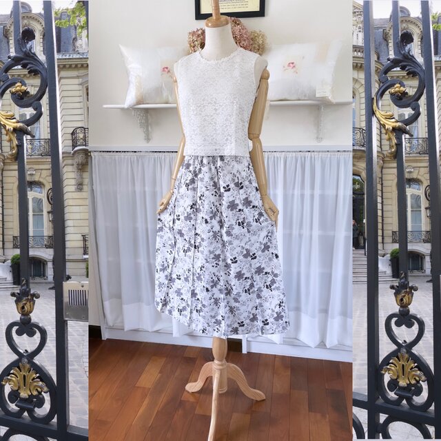 ♦️Sale!♦️グレー系花柄ロングスカート『サイズフリー・10枚剥ぎ・フレア・Aライン・コットン・ウエストゴム・裏地付き』