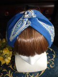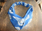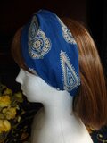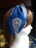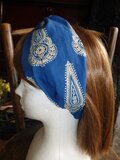 藍色に大きなペイズリー柄のオリエンタルな雰囲気のクロスヘアバンドです。素材はコットンです。