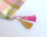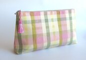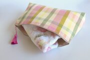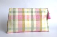 ピンク、クリーム、若草グリーンの大きなチェック柄が楽しいポーチです。