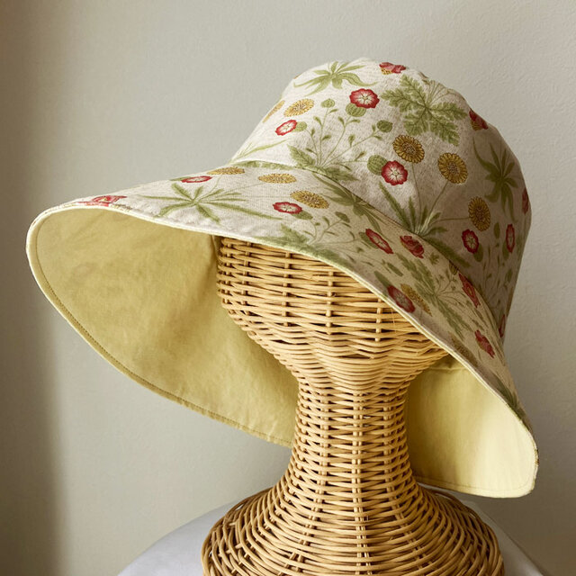 使いやすく、優しいイエローの草木染めの自然なお色と、Best of Morrisのデイジーのプリント柄の面を、その時の装いや気分で使い分けていただければ幸いです。
